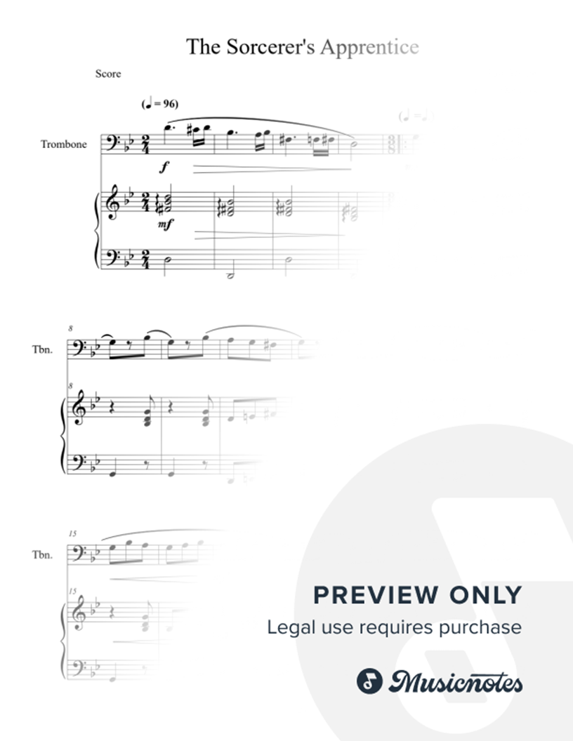 Best known for its appearance in Disney's 1940 animated classic Fantasia, this is french composer Paul Dukas's The Sorcerer's Apprentice arranged for trombone solo with piano accompaniment. Great for lessons, recitals, and performances of all kinds. Intermediate level. Includes score and parts.
