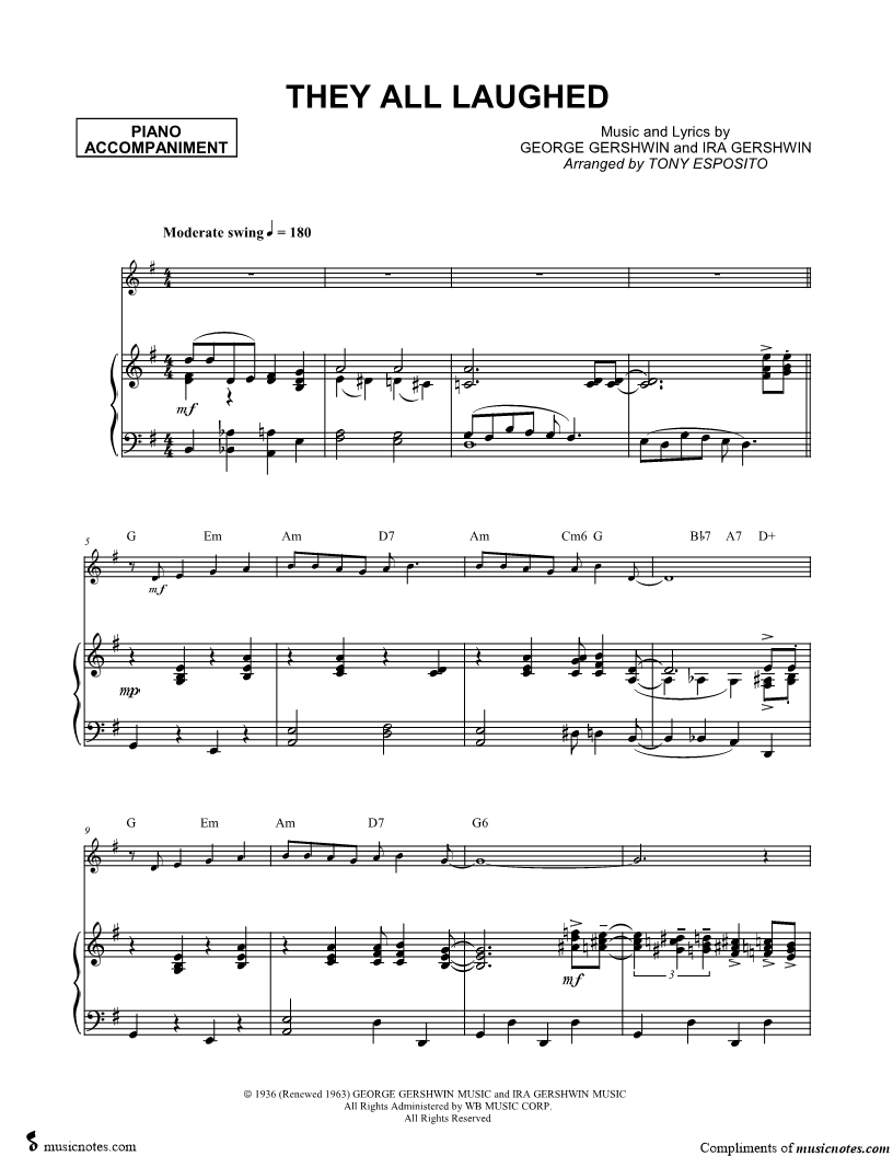 1. They All Laughed - Piano Accompaniment (click here to preview and play this piece) Composer: Lyricist: Scored For:Instrumental Part and Solo & Accompaniment Instruments:Piano Accompaniment and Any Instrument, range: D4-E5 Number of pages:3 Click here to purchase this piece separately for $5.99 |