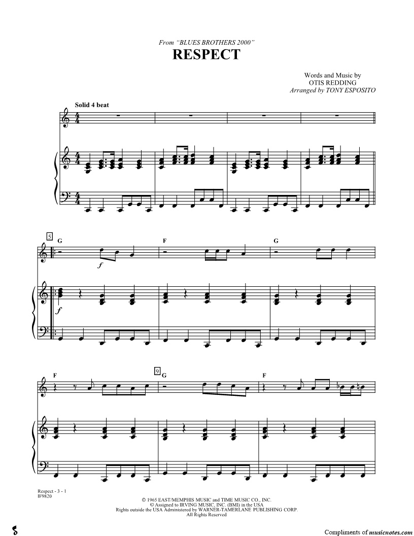 1. Respect - Piano Accompaniment (click here to preview and play this piece) Performers: Composer: Lyricist: Scored For:Instrumental Part Instruments:Piano Accompaniment, C Instrument, Violin, Oboe, Flute and Recorder Number of pages:3 Click here to purchase this piece separately for $5.99 |