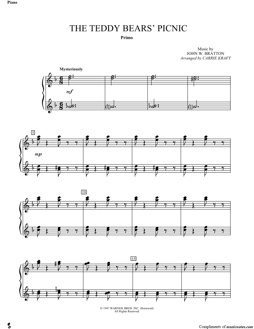 1. The Teddy Bears' Picnic (click here to preview and play this piece) Composer: Lyricist: Scored For:Instrumental Part Instrument:Piano Number of pages:3 Click here to purchase this piece separately for $4.99 |