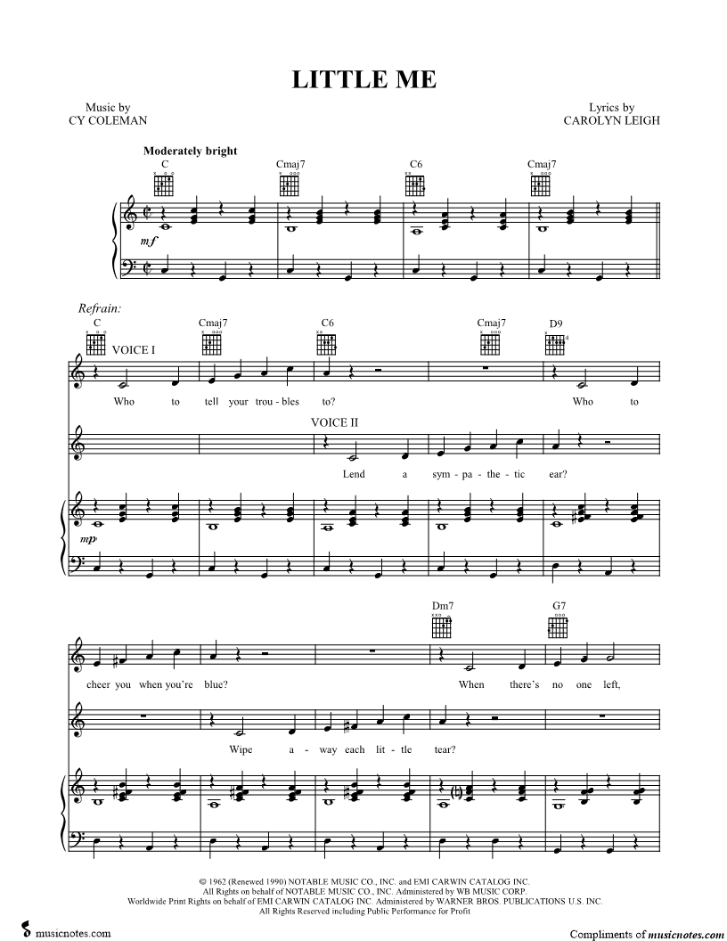 1. Little Me (click here to preview and play this piece) Composer: Lyricist: Scored For:Singer Pro, Duet+Accompaniment and Piano/Vocal/Guitar Instruments:Voice 2, range: C4-Bb5, Piano, Voice 1, range: C4-Bb5 and Guitar Number of pages:8 Click here to purchase this piece separately for $5.99 |