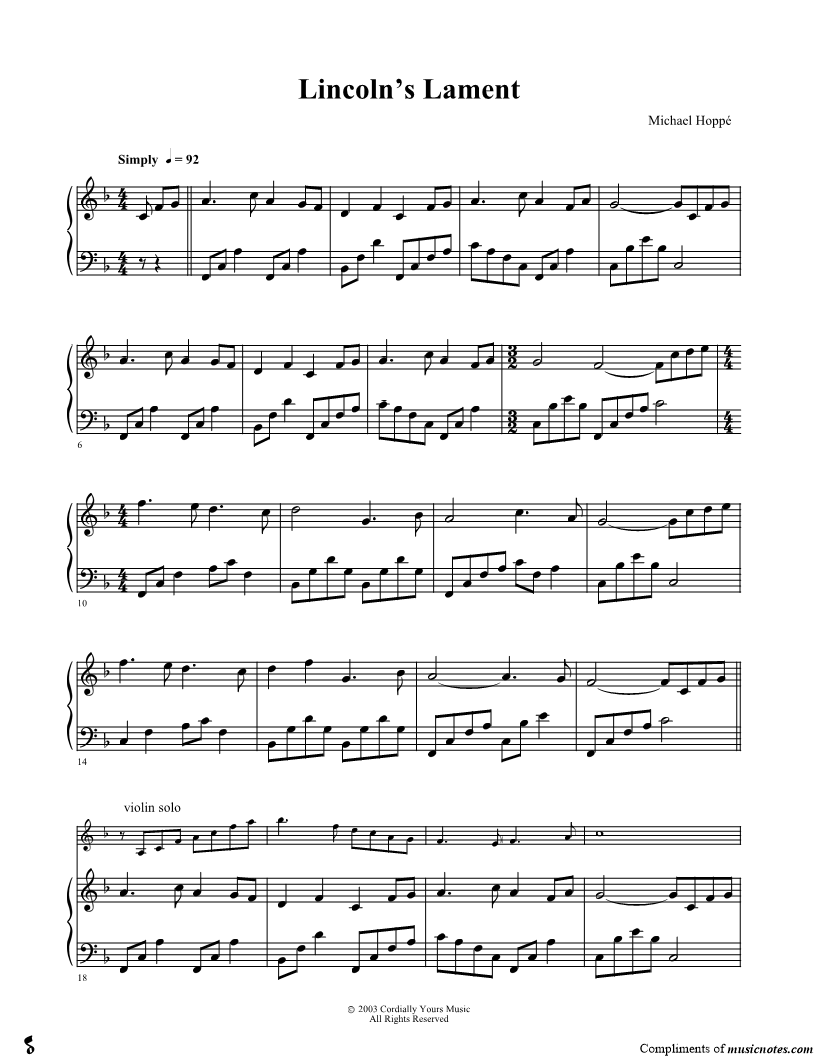 1. Lincoln's Lament (click here to preview and play this piece) Performer: Composer: Scored For:Solo & Accompaniment Instruments:Violin 1, range: A3-D6 and Piano Accompaniment Number of pages:4 Click here to purchase this piece separately for $4.99 |