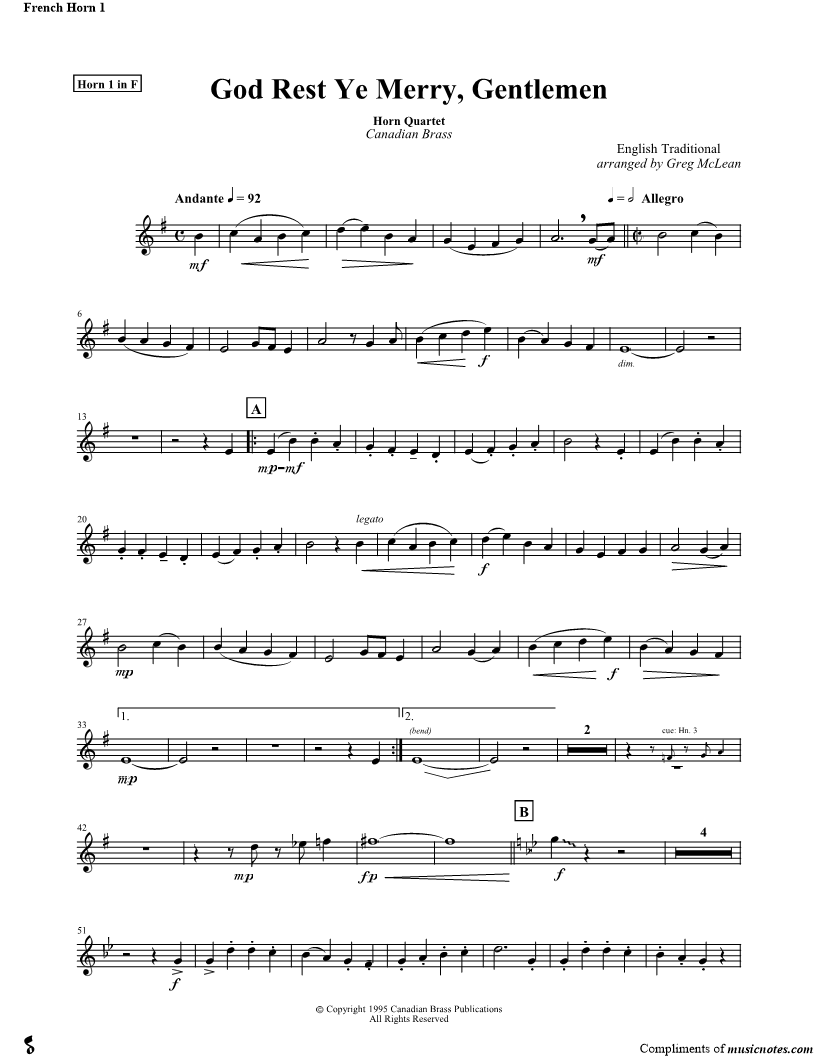1. God Rest Ye Merry, Gentlemen - Horn 1 (click here to preview and play this piece) Performer: Composer: Scored For:Instrumental Part Instrument:French Horn 1, range: D4-C6 Number of pages:2 Click here to purchase this piece separately for $4.99 |