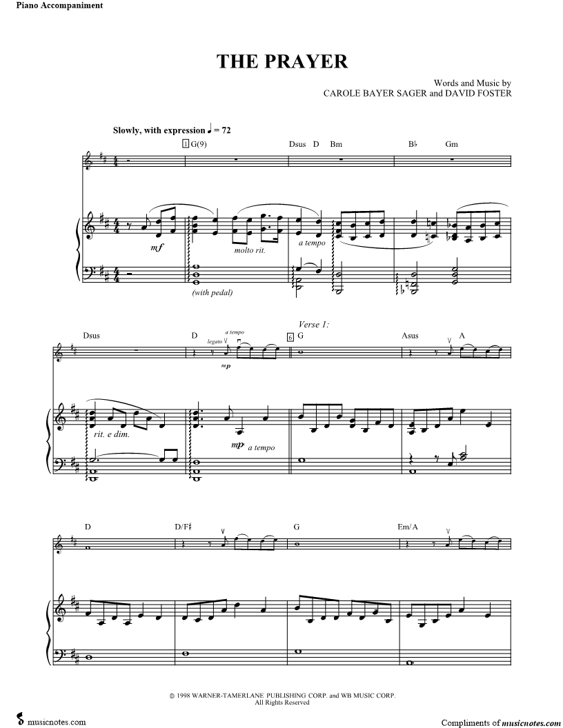 1. The Prayer (click here to preview and play this piece) Performers: Composers: Lyricists: Scored For:Instrumental Part Instrument:Piano Accompaniment Number of pages:5 Click here to purchase this piece separately for $5.99 |