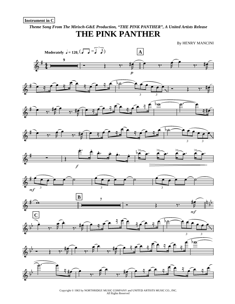 1. The Pink Panther - Flute (click here to preview and play this piece) Performers: Composer: Scored For:Instrumental Part Instruments:C Instrument, range: D4-G6, Flute, range: D4-G6, Violin, Oboe and Recorder Number of pages:2 Click here to purchase this piece separately for $4.99 |
