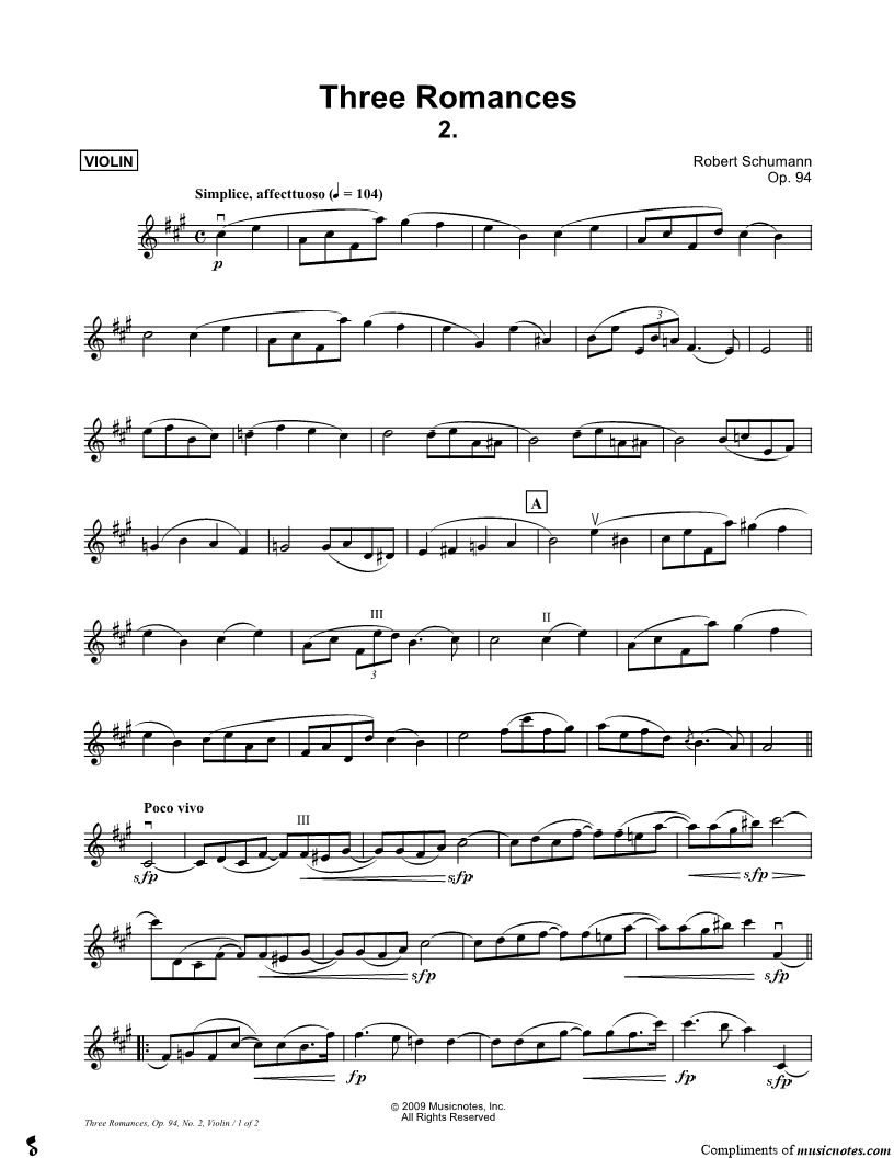 1. Three Romances, Op. 94, No. 2 - Violin Part (click here to preview and play this piece) Composer: Scored For:Instrumental Solo Instrument:Violin, range: B#3-C#6 Number of pages:2 Click here to purchase this piece separately for $4.99 |