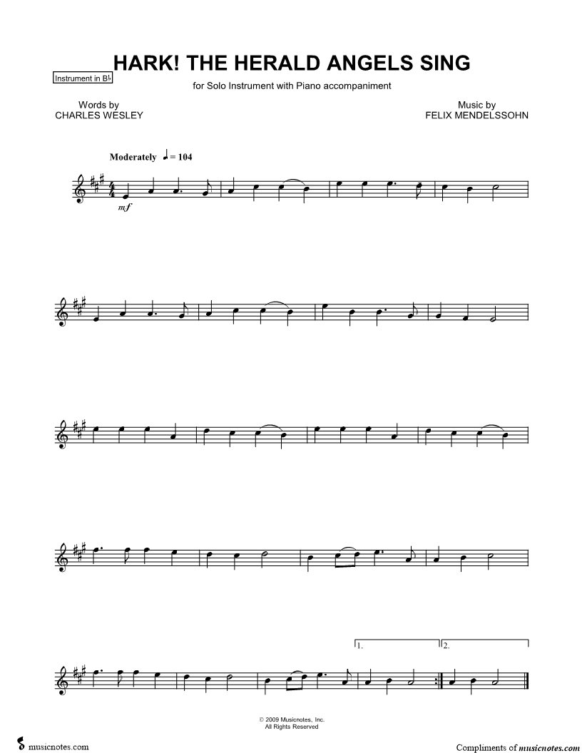 1. Hark! the Herald Angels Sing - Bb Instrument (click here to preview and play this piece) Composer: Lyricist: Scored For:Instrumental Solo Instruments:Bb Instrument, range: E4-F#5, Trumpet, Soprano Saxophone, Tenor Saxophone and Clarinet Number of pages:1 Click here to purchase this piece separately for $4.99 |