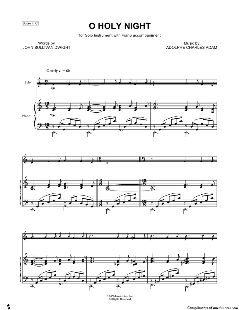 1. O Holy Night - Piano Accompaniment (click here to preview and play this piece) Composer: Lyricist: Scored For:Solo & Accompaniment and Instrumental Part Instruments:Piano Accompaniment, C Instrument 1, range: C4-E5, Violin, Oboe, Flute and Recorder Number of pages:3 Click here to purchase this piece separately for $4.99 |