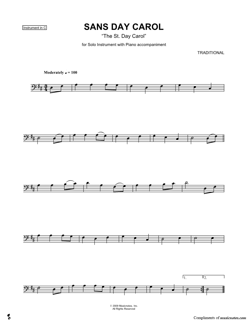 1. Sans Day Carol - Bass Clef Instrument (click here to preview and play this piece) Composer: Lyricist: Scored For:Instrumental Solo Instruments:Bass Clef Instrument, range: C#3-D4, Cello, Double Bass, Trombone, Bassoon and Baritone Horn Number of pages:1 Click here to purchase this piece separately for $4.99 |