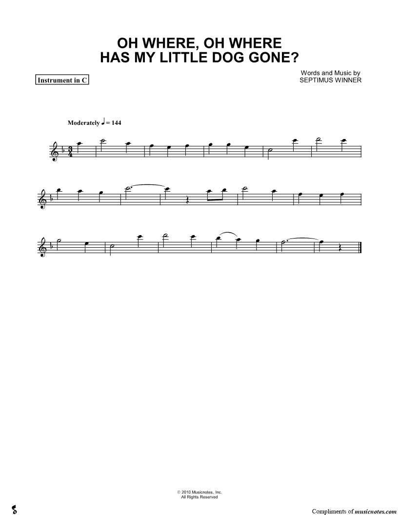 1. Oh Where, Oh Where Has My Little Dog Gone? - C Instrument (click here to preview and play this piece) Composer: Lyricist: Scored For:Instrumental Solo Instruments:C Instrument, range: C5-D6, Flute, Recorder, Violin and Oboe Number of pages:1 Click here to purchase this piece separately for $4.99 |
