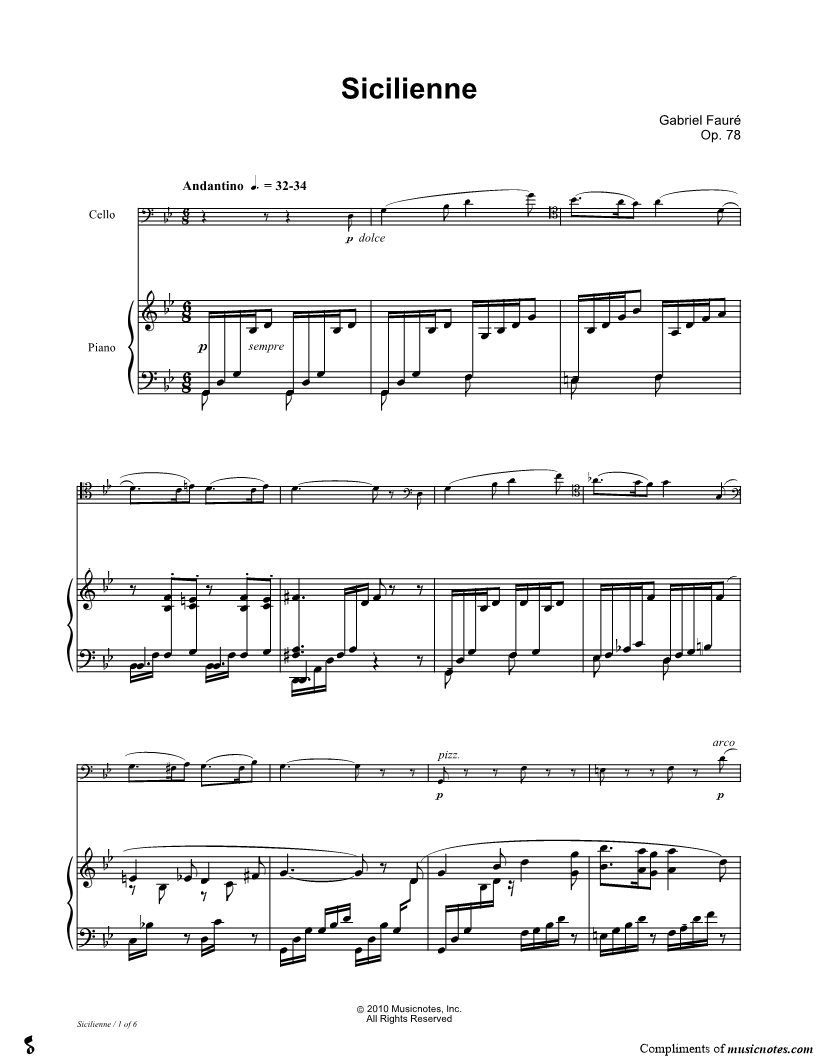 1. Sicilienne, Op. 78 - Piano Accompaniment (click here to preview and play this piece) Composer: Scored For:Solo & Accompaniment and Instrumental Part Instruments:Cello, range: D2-C5 and Piano Accompaniment Number of pages:6 Click here to purchase this piece separately for $5.99 |