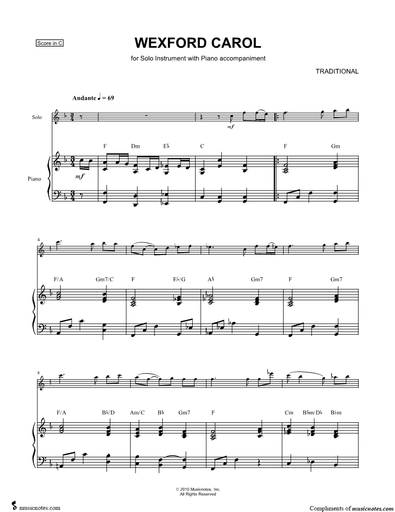 1. Wexford Carol - Piano Accompaniment (click here to preview and play this piece) Composer: Lyricist: Scored For:Instrumental Part and Solo & Accompaniment Instruments:Piano Accompaniment, C Instrument, range: C5-Eb6, Recorder, Oboe, Violin and Flute Number of pages:2 Click here to purchase this piece separately for $4.99 |