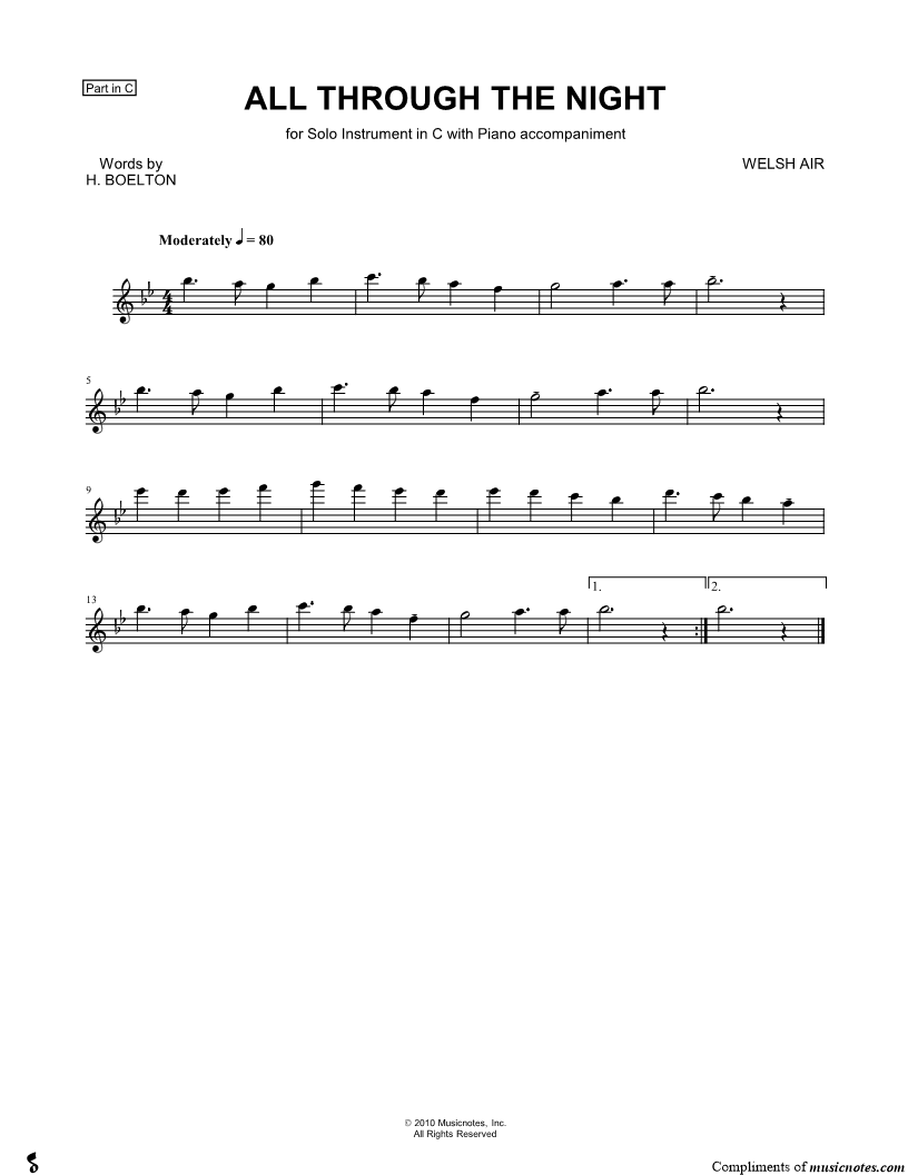 1. All Through the Night - C Instrument (click here to preview and play this piece) Composer: Lyricist: Scored For:Instrumental Solo and Instrumental Part Instruments:C Instrument, range: F5-G6, Recorder, Oboe, Violin and Flute Number of pages:1 Click here to purchase this piece separately for $4.99 |