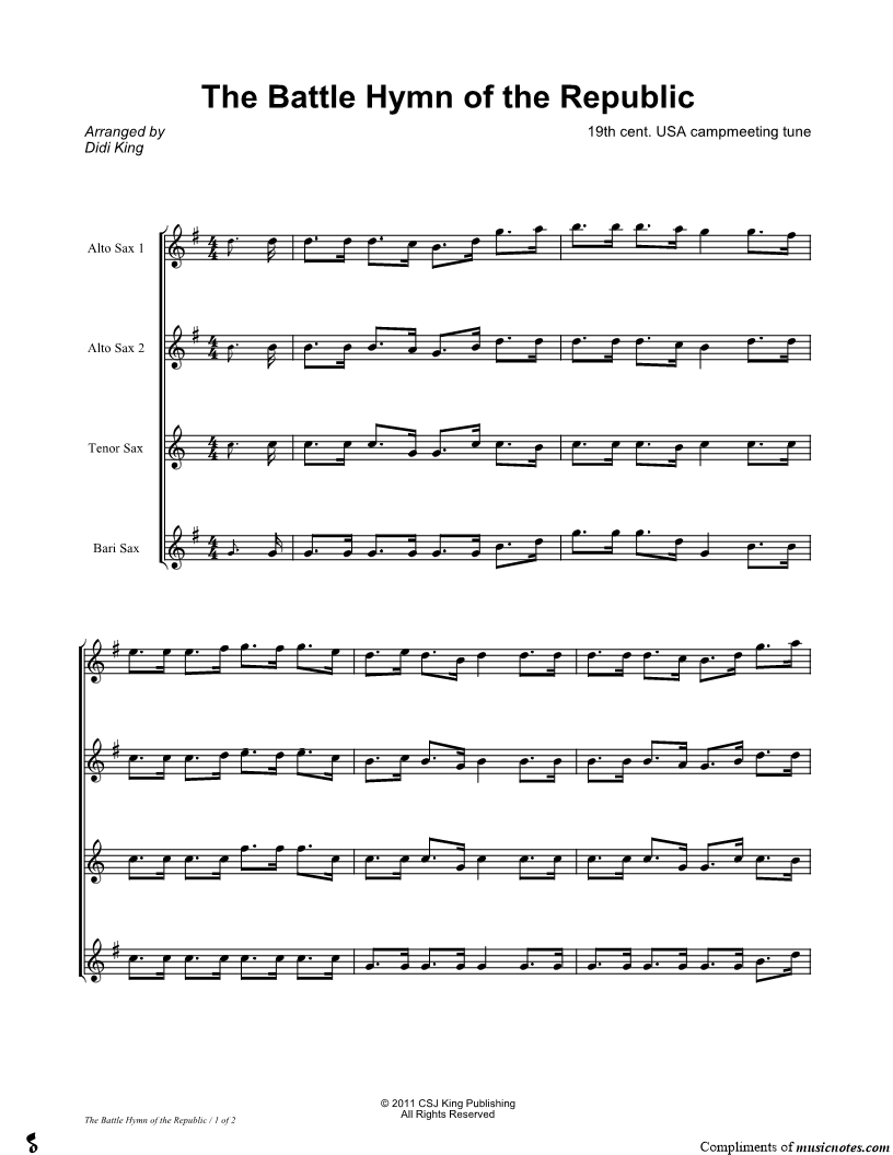 1. Battle Hymn of the Republic - Saxophone Quartet Score (click here to preview and play this piece) Composer: Lyricist: Scored For:Saxophone Quartet and Score Instruments:Alto Saxophone 1, range: B4-B5, Alto Saxophone 2, range: G4-F5, Tenor Saxophone and Baritone Saxophone Number of pages:2 Click here to purchase this piece separately for $4.99 |