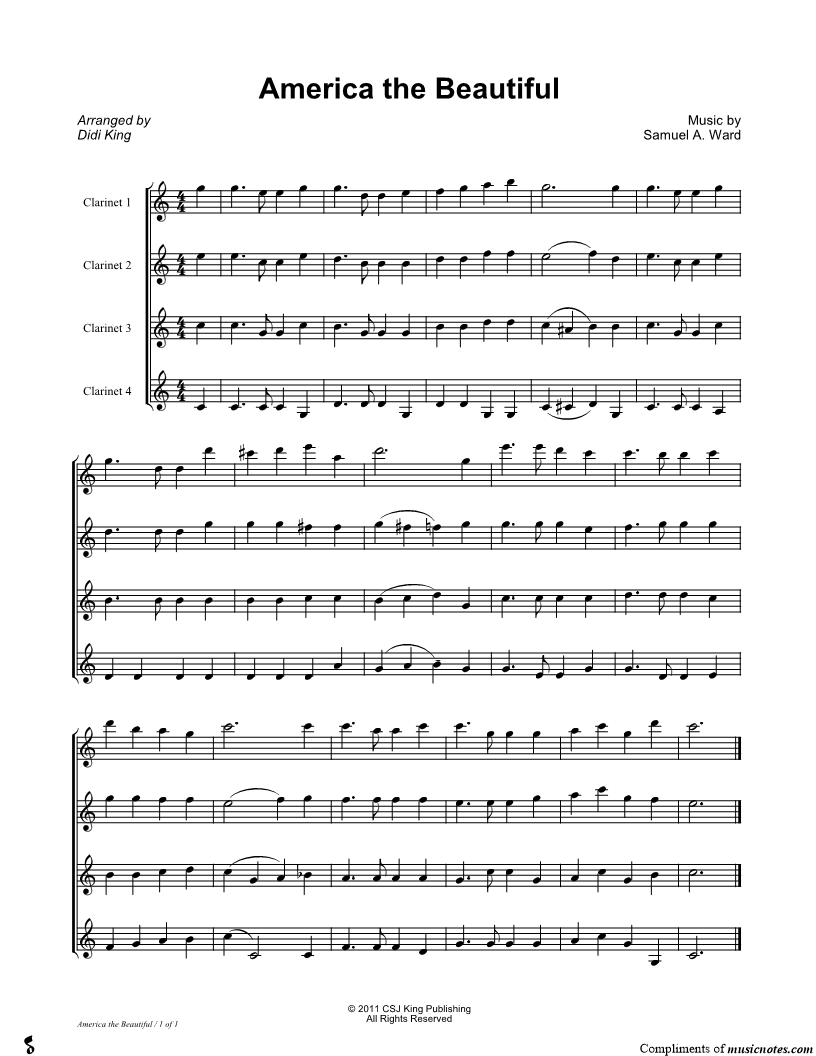 2. America the Beautiful - Clarinet 1 Part (Clarinet Quartet) (click here to preview and play this piece) Composer: Lyricist: Scored For:Instrumental Part Instrument:Clarinet 1, range: D5-E6 Number of pages:1 Click here to purchase this piece separately for $4.99 |