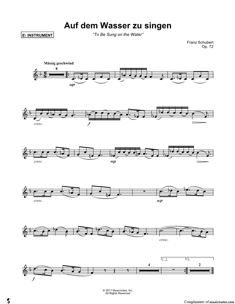 1. Auf dem Wasser zu singen - Eb Instrument (click here to preview and play this piece) Composer: Scored For:Instrumental Solo Instruments:Eb Instrument, range: C4-Eb5, Baritone Saxophone and Alto Saxophone Number of pages:1 Click here to purchase this piece separately for $4.99 |