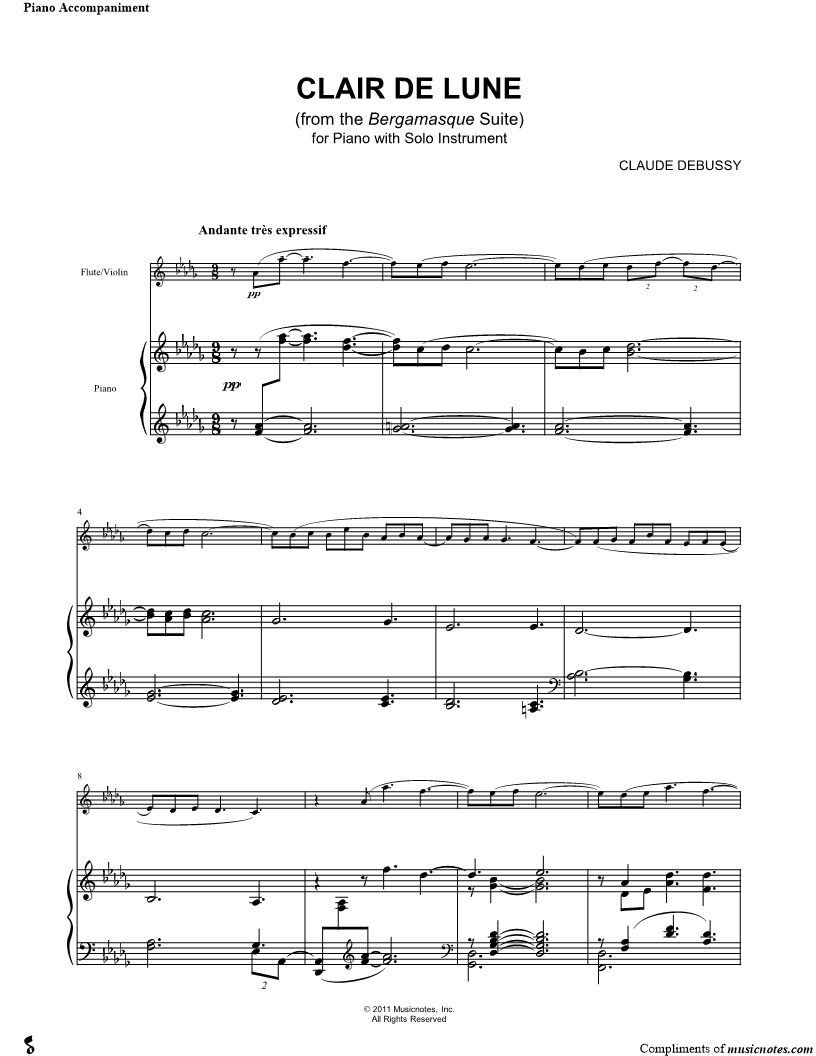1. Clair de lune - Piano Accompaniment (click here to preview and play this piece) Composer: Scored For:Solo & Accompaniment and Instrumental Part Instrument:Piano Accompaniment Number of pages:8 Click here to purchase this piece separately for $5.99 |