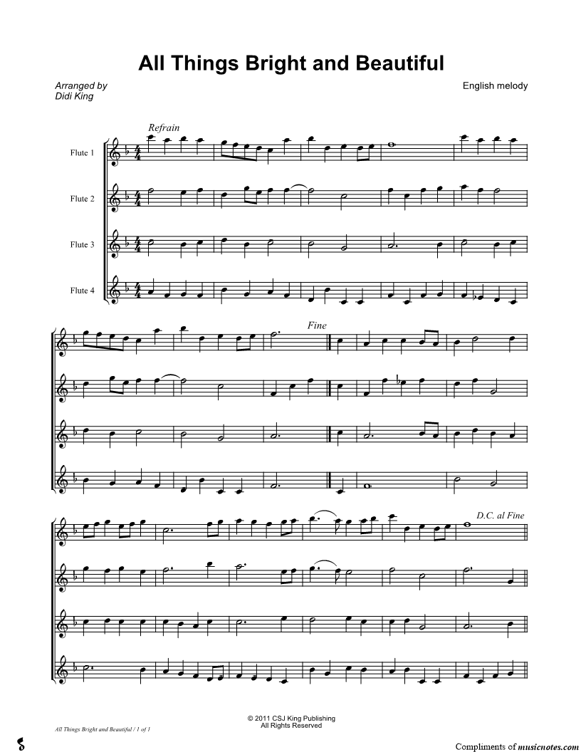 1. All Things Bright and Beautiful - Score (Flute Quartet) (click here to preview and play this piece) Composers: Lyricist: Scored For:Instrumental Quartet and Score Instruments:Flute 1, range: A4-C6, Flute 2, range: F4-Bb5, Flute 3, range: G4-E5 and Flute 4, range: C4-C5 Number of pages:1 Click here to purchase this piece separately for $4.99 |