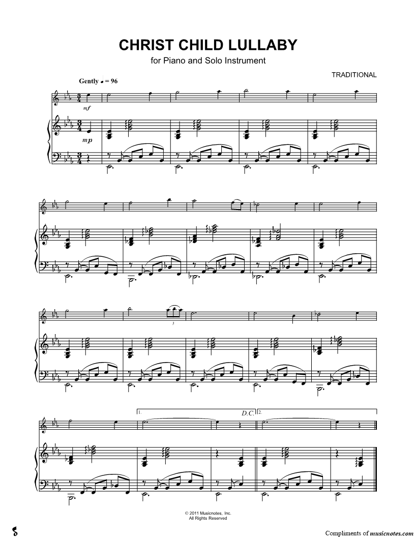 1. Christ Child Lullaby - Piano Accompaniment (click here to preview and play this piece) Composer: Scored For:Solo & Accompaniment and Instrumental Part Instruments:Piano Accompaniment, C Instrument, range: Bb4-Bb5, Oboe, Flute, Violin and Recorder Number of pages:1 Click here to purchase this piece separately for $4.99 |