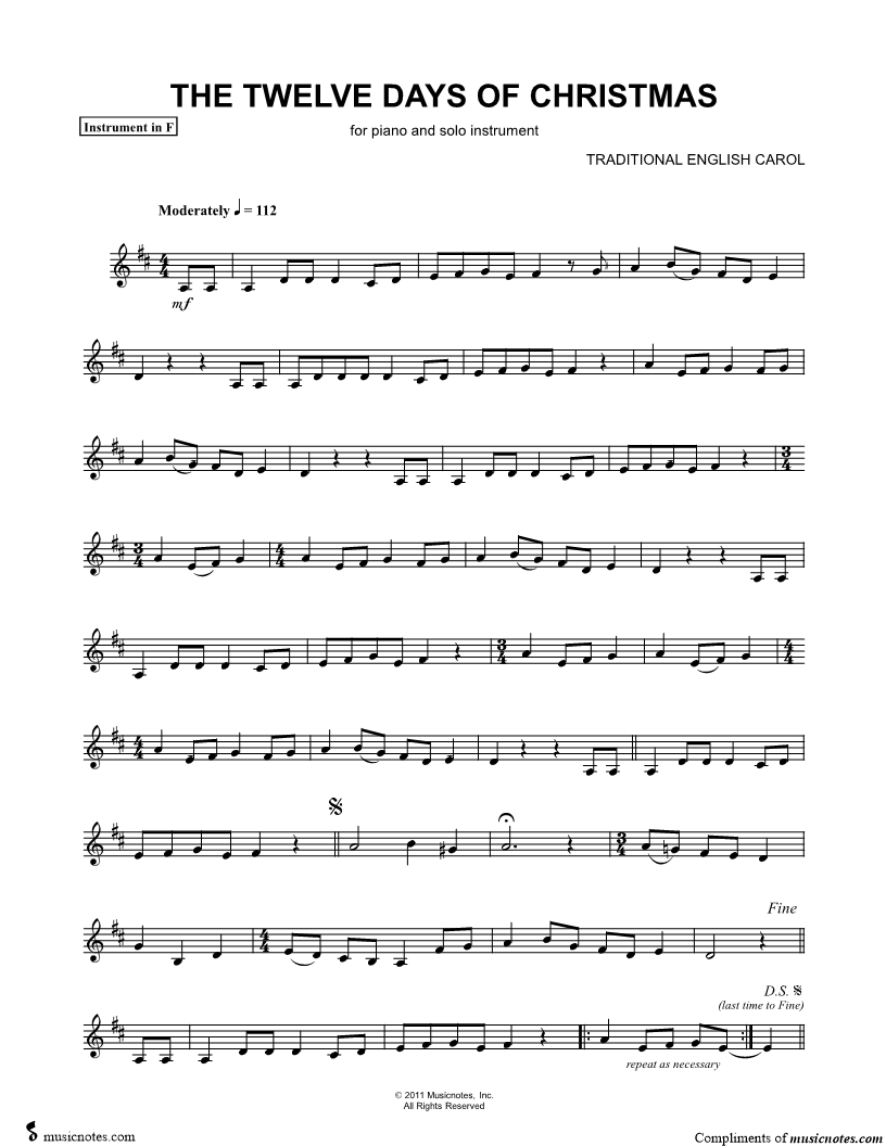 1. The Twelve Days of Christmas - F Instrument (click here to preview and play this piece) Composer: Scored For:Instrumental Solo and Instrumental Part Instrument:F Instrument, range: A4-B5 Number of pages:1 Click here to purchase this piece separately for $4.99 |