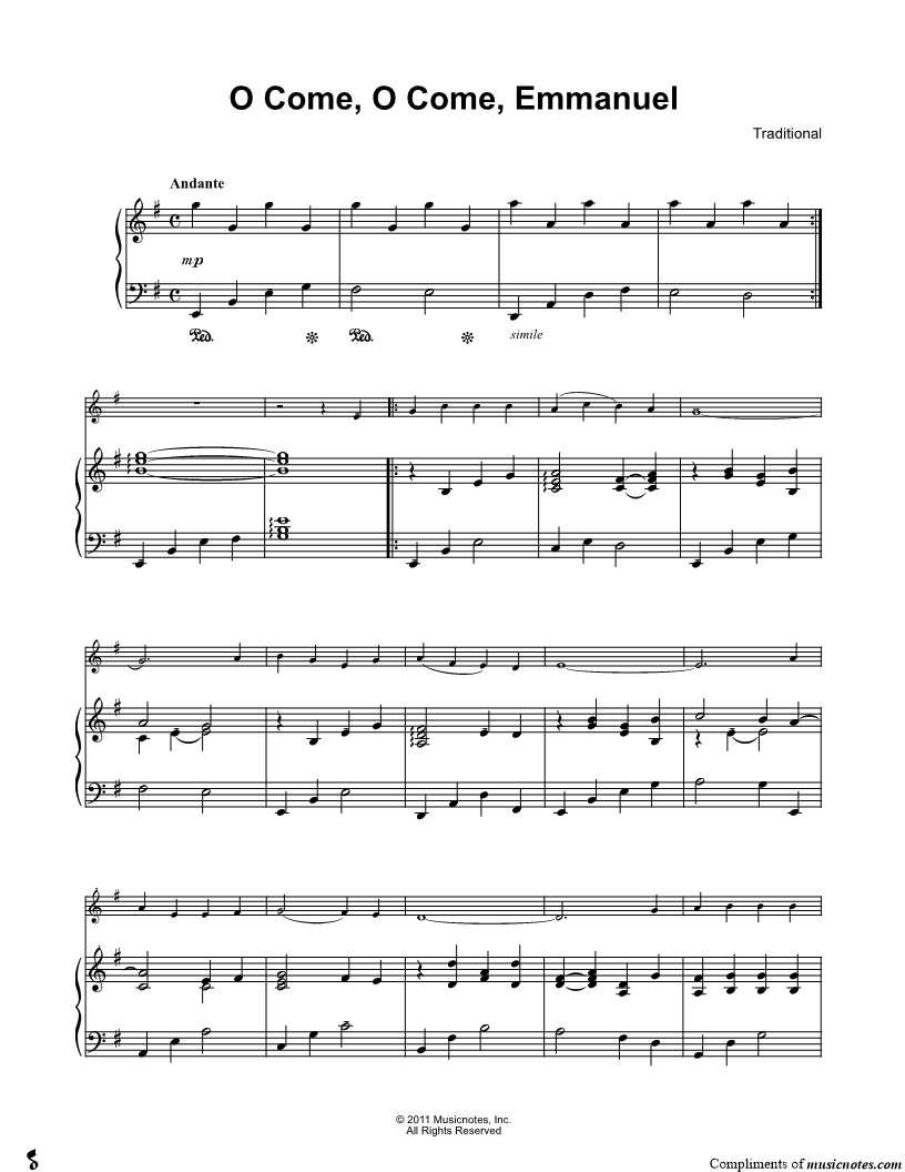 1. O Come, O Come, Emmanuel - Piano Accompaniment (click here to preview and play this piece) Composer: Lyricists: Scored For:Solo & Accompaniment and Instrumental Part Instruments:Piano Accompaniment, C Instrument, range: D4-D5, Flute, Violin, Oboe and Recorder Number of pages:2 Click here to purchase this piece separately for $4.99 |