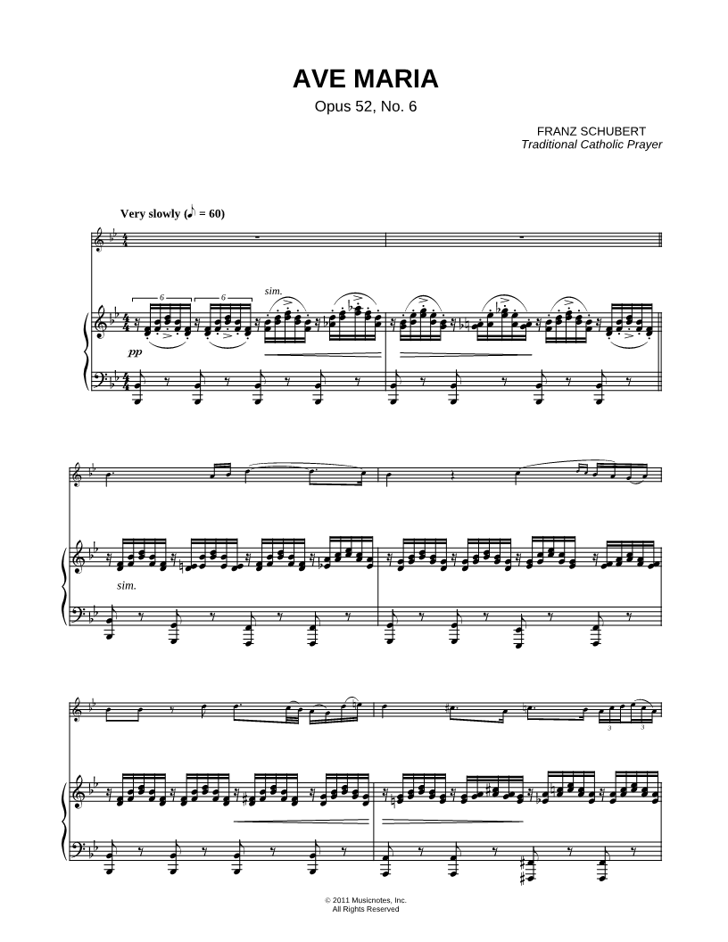 1. Ave Maria, Opus 52, No. 6 - Piano Accompaniment (click here to preview and play this piece) Composer: Lyricist: Scored For:Solo & Accompaniment and Instrumental Part Instruments:Piano Accompaniment, C Instrument, range: F4-F5, Recorder, Flute, Oboe and Violin Number of pages:4 Click here to purchase this piece separately for $4.99 |