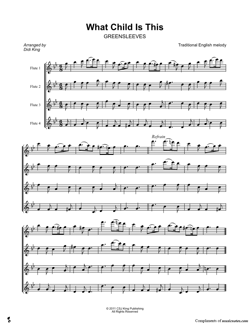 1. What Child Is This? - Flute Quartet Score (click here to preview and play this piece) Composer: Lyricist: Scored For:Instrumental Quartet and Score Instruments:Flute 1, range: D5-F6, Flute 2, range: C5-D6, Flute 3, range: G4-F5 and Flute 4, range: C4-D5 Number of pages:1 Click here to purchase this piece separately for $4.99 |