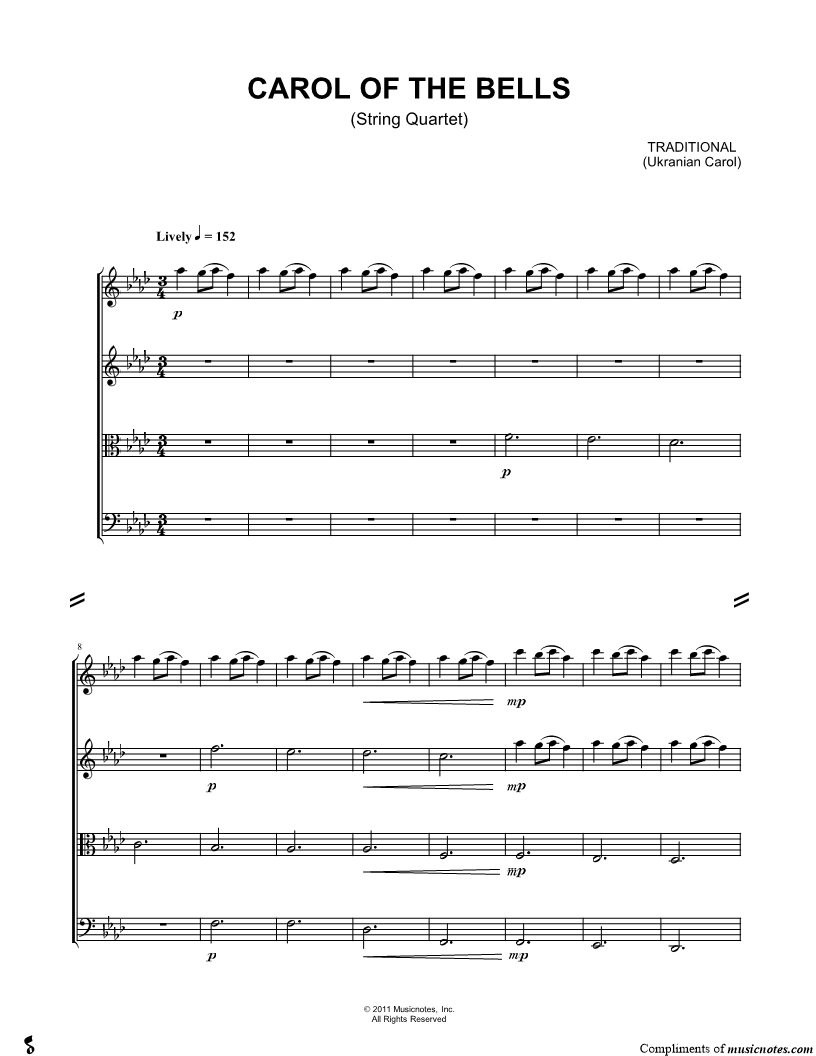 1. Carol of the Bells - String Quartet Score (click here to preview and play this piece) Composer: Lyricist: Scored For:Score and String Quartet Instruments:Violin 1, range: F4-F6, Violin 2, range: G3-C6, Viola, range: Bb2-F5 and Cello, range: C2-F3 Number of pages:3 Click here to purchase this piece separately for $5.79 |