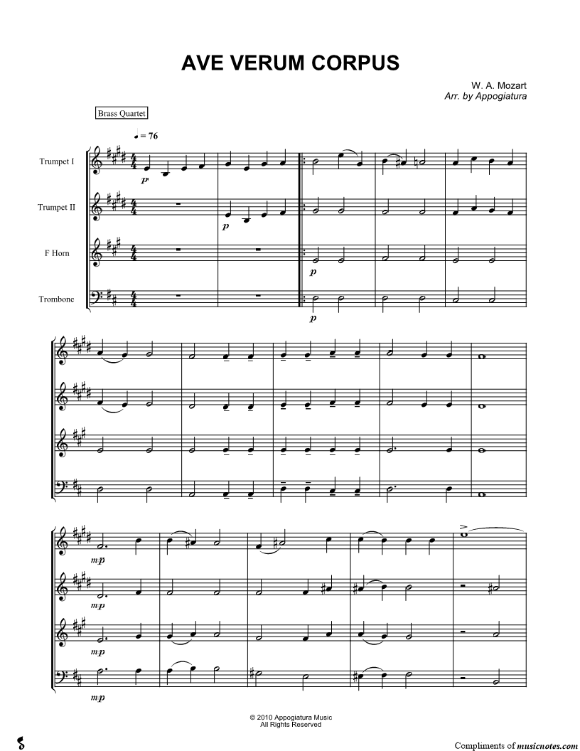 1. Ave verum corpus, K. 618 - Brass Quartet Score (click here to preview and play this piece) Composer: Scored For:Brass Quartet and Score Instruments:Trumpet 1, range: B3-F#5, Trumpet 2, range: B3-B4, French Horn, range: C#4-B4 and Trombone, range: D2-B3 Number of pages:3 Click here to purchase this piece separately for $5.79 |