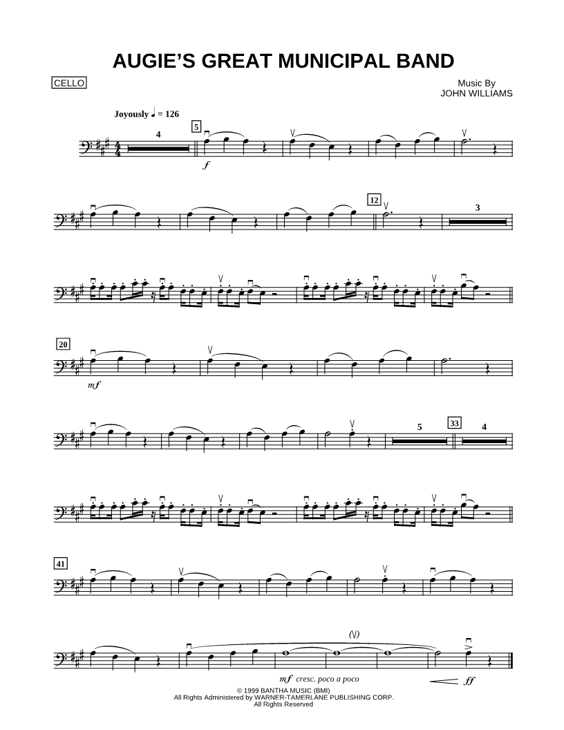 1. Augie's Great Municipal Band - Cello (click here to preview and play this piece) Composer: Scored For:Instrumental Solo Instrument:Cello, range: E4-C#5 Number of pages:1 Click here to purchase this piece separately for $4.99 |