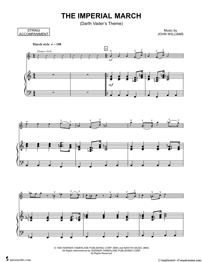 1. The Imperial March - Piano Accompaniment (click here to preview and play this piece) Composer: Scored For:Solo & Accompaniment and Instrumental Part Instruments:Violin, range: D4-A5 and Piano Accompaniment Number of pages:3 Click here to purchase this piece separately for $5.99 |