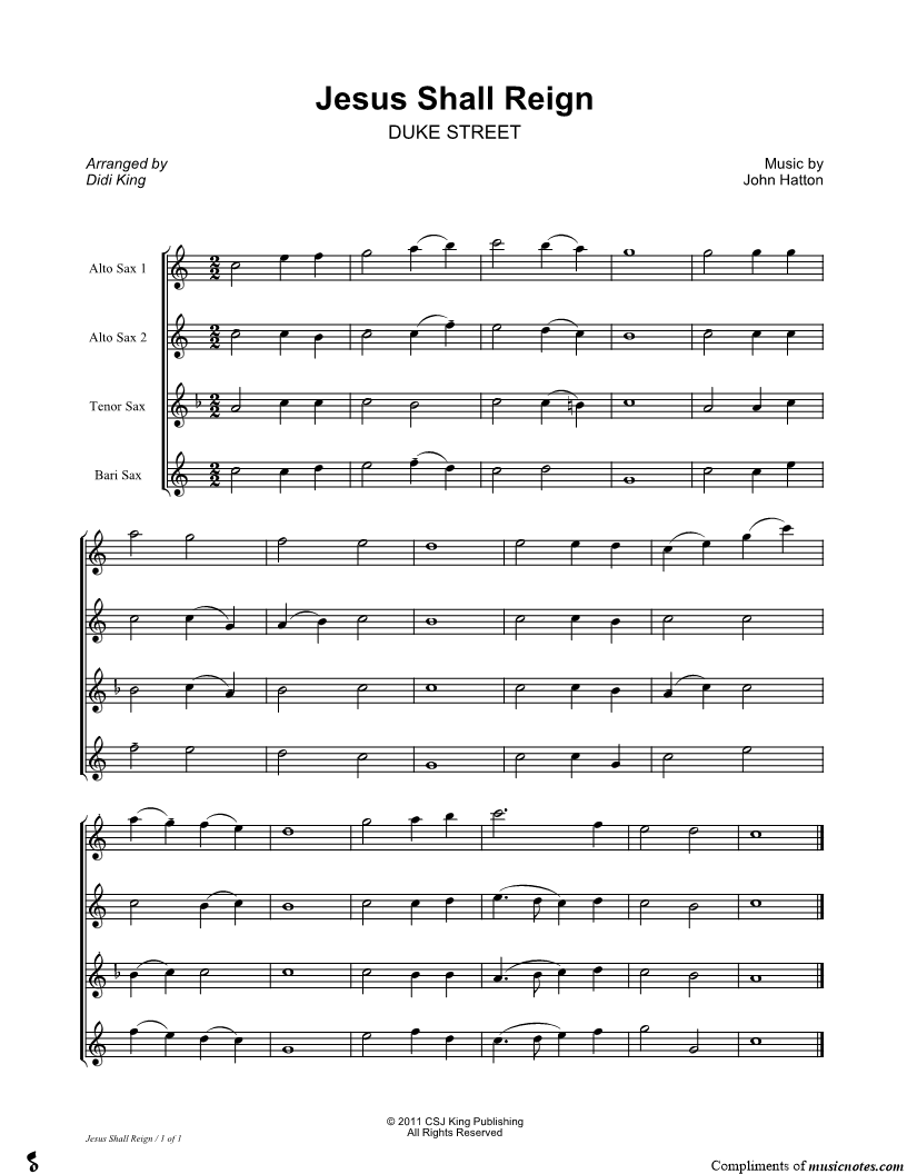 1. Jesus Shall Reign - Score (Saxophone Quartet) (click here to preview and play this piece) Composer: Lyricist: Scored For:Saxophone Quartet and Score Instruments:Alto Saxophone 1, range: C5-C6, Alto Saxophone 2, range: G4-F5, Tenor Saxophone, range: A4-D5 and Baritone Saxophone Number of pages:1 Click here to purchase this piece separately for $4.99 |