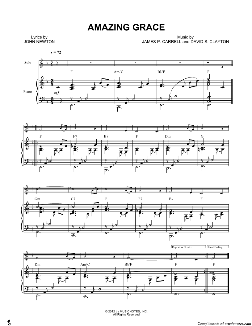 1. Amazing Grace - Piano Accompaniment (click here to preview and play this piece) Composer: Lyricist: Scored For:Solo & Accompaniment and Instrumental Part Instruments:Piano Accompaniment, C Instrument, range: C4-C5, Violin, Oboe, Flute and Recorder Number of pages:1 Click here to purchase this piece separately for $4.99 |