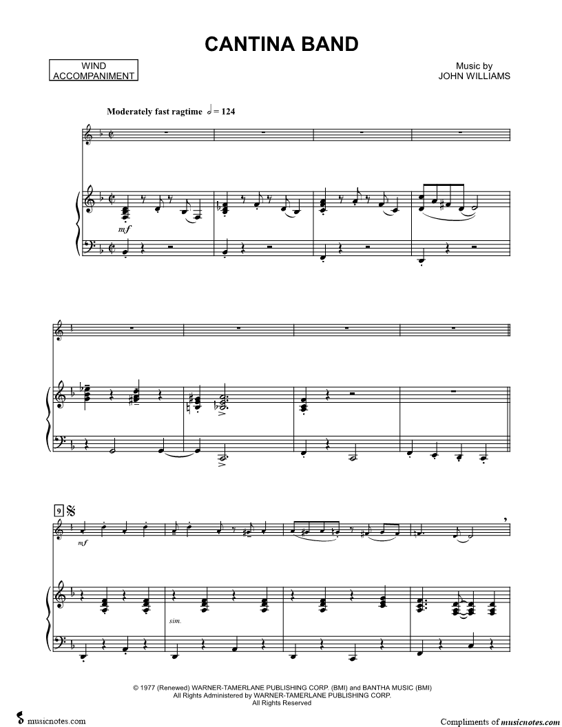 1. Cantina Band - Piano Accompaniment (Winds) (click here to preview and play this piece) Composer: Scored For:Solo & Accompaniment and Instrumental Part Instruments:Piano Accompaniment, C Instrument, range: C4-F5, Violin, Oboe, Flute and Recorder Number of pages:4 Click here to purchase this piece separately for $5.99 |