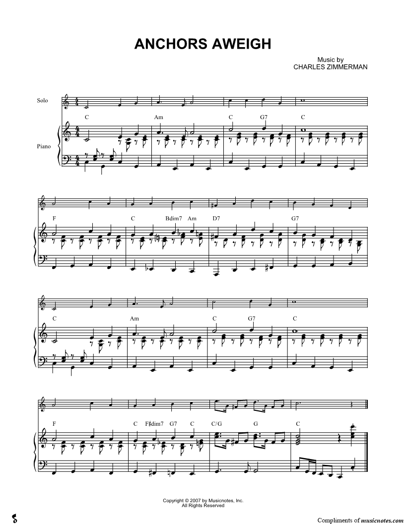 1. Anchors Aweigh - Piano Accompaniment (click here to preview and play this piece) Performer: Composer: Lyricists: Scored For:Solo & Accompaniment and Instrumental Part Instruments:Piano Accompaniment, C Instrument, range: C4-E5, Violin, Oboe, Flute and Recorder Number of pages:1 Click here to purchase this piece separately for $4.99 |