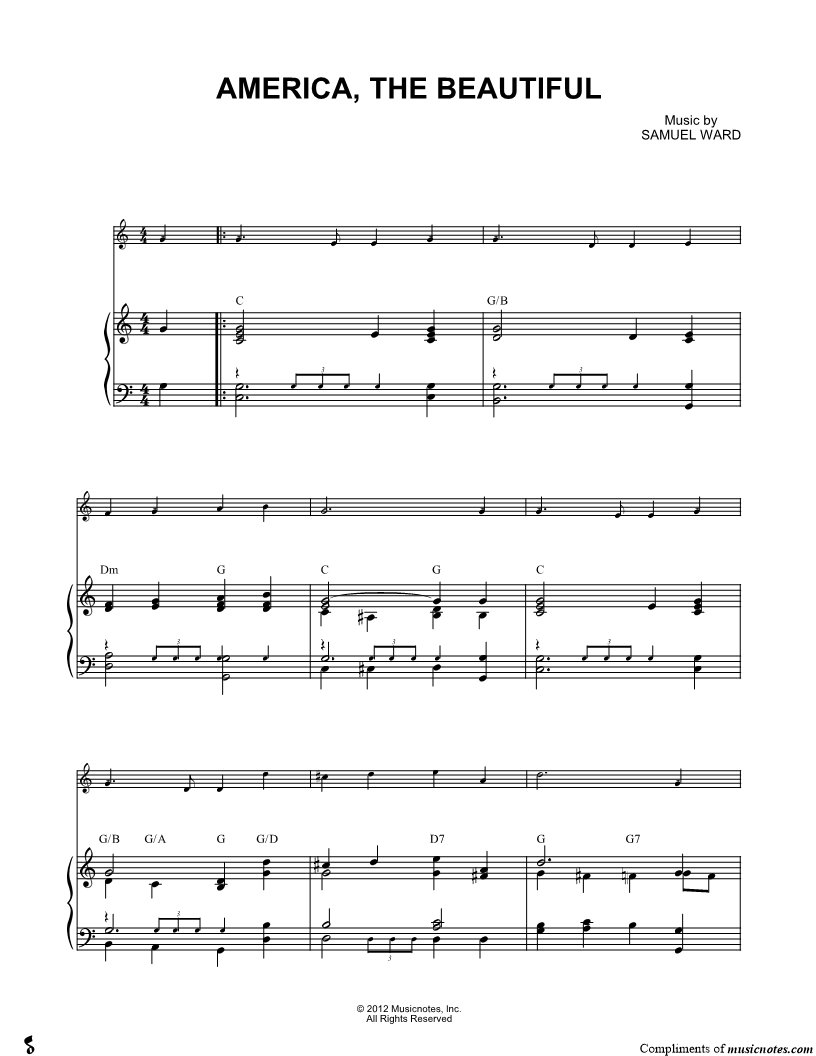 1. America the Beautiful - Piano Accompaniment (click here to preview and play this piece) Composer: Lyricist: Scored For:Solo & Accompaniment and Instrumental Parts Instruments:Piano Accompaniment, C Instrument, range: D4-E5, Violin, Oboe, Flute and Recorder Number of pages:2 Click here to purchase this piece separately for $5.99 |