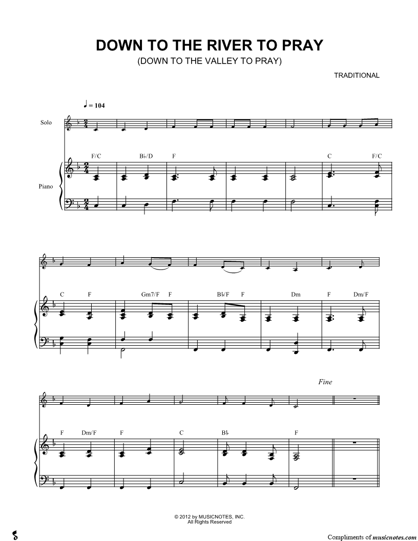 1. Down to the River to Pray - Piano Accompaniment (click here to preview and play this piece) Composer: Lyricist: Scored For:Solo & Accompaniment and Instrumental Part Instruments:Piano Accompaniment, C Instrument, range: A3-C5, Violin, Oboe, Flute and Recorder Number of pages:2 Click here to purchase this piece separately for $4.99 |