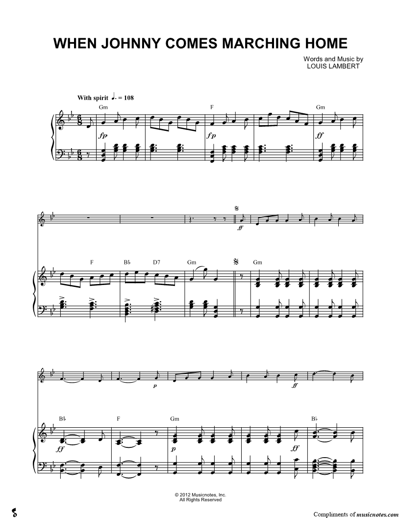 1. When Johnny Comes Marching Home - Piano Accompaniment (click here to preview and play this piece) Composer: Lyricist: Scored For:Solo & Accompaniment and Instrumental Part Instruments:Piano Accompaniment, C Instrument, range: D4-D5, Violin, Oboe, Flute and Recorder Number of pages:3 Click here to purchase this piece separately for $4.99 |