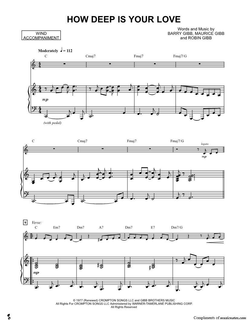 1. How Deep Is Your Love - Piano Accompaniment (Winds) (click here to preview and play this piece) Performer: Composers: Lyricists: Scored For:Solo & Accompaniment and Instrumental Part Instruments:Piano Accompaniment, C Instrument, Violin, Oboe, Flute and Recorder Number of pages:3 Click here to purchase this piece separately for $5.99 |