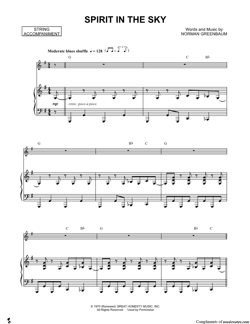 1. Spirit in the Sky - Piano Accompaniment (Strings) (click here to preview and play this piece) Performer: Composer: Lyricist: Scored For:Solo & Accompaniment and Instrumental Part Instruments:Violin and Piano Accompaniment Number of pages:5 Click here to purchase this piece separately for $5.99 |