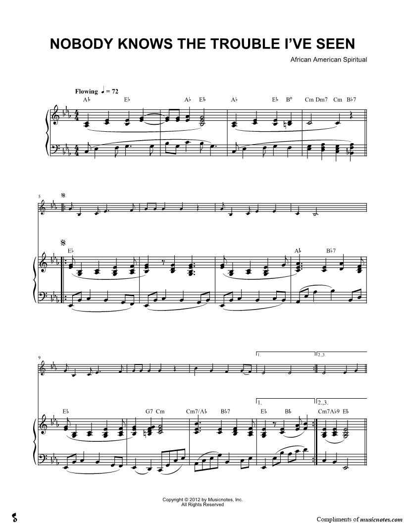 1. Nobody Knows the Trouble I've Seen - Piano Accompaniment (click here to preview and play this piece) Composer: Lyricist: Scored For:Solo & Accompaniment and Instrumental Part Instruments:Piano Accompaniment, C Instrument, range: Bb3-Bb4, Violin, Oboe, Flute and Recorder Number of pages:2 Click here to purchase this piece separately for $5.99 |