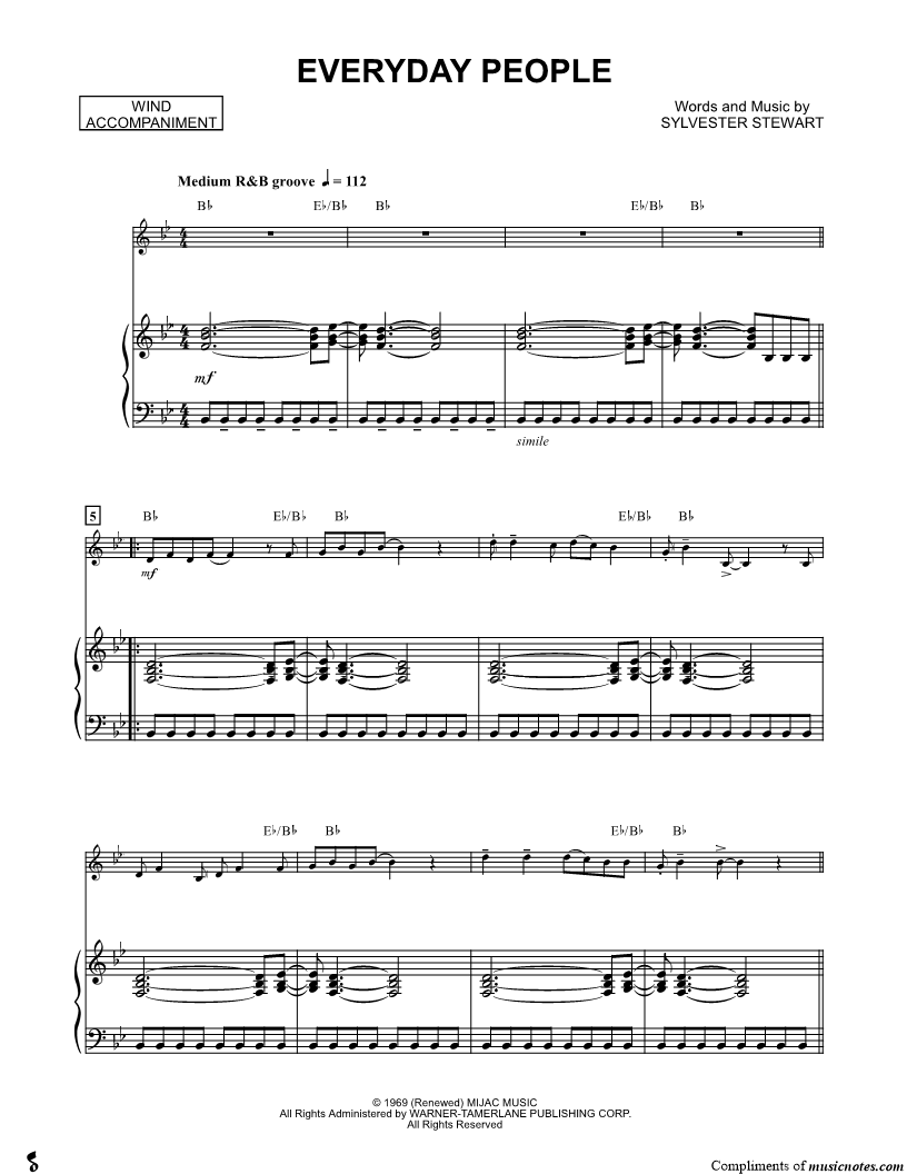 1. Everyday People - Piano Accompaniment (Winds) (click here to preview and play this piece) Performer: Composer: Lyricist: Scored For:Solo & Accompaniment and Instrumental Part Instruments:Piano Accompaniment, C Instrument, range: Bb3-D5, Violin, Oboe, Flute and Recorder Number of pages:3 Click here to purchase this piece separately for $5.99 |