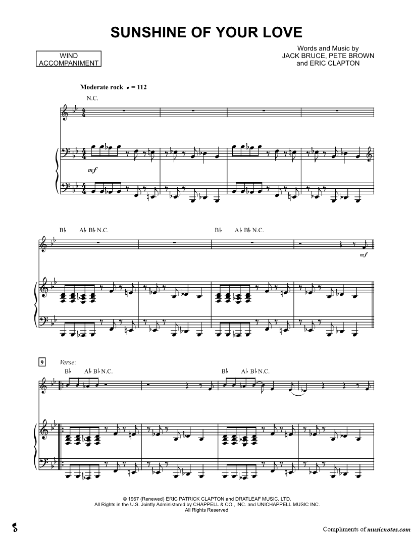 1. Sunshine of Your Love - Piano Accompaniment (Winds) (click here to preview and play this piece) Performer: Composers: Lyricists: Scored For:Solo & Accompaniment and Instrumental Part Instruments:Piano Accompaniment, C Instrument, range: Db4-F5, Violin, Oboe, Flute and Recorder Number of pages:3 Click here to purchase this piece separately for $5.99 |