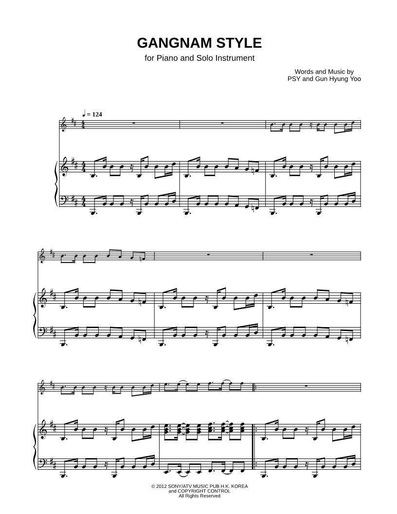 1. Gangnam Style - Piano Accompaniment (click here to preview and play this piece) Performer: Composers: Gun Hyung Yoo and PSY Lyricists: Gun Hyung Yoo and PSY Scored For:Solo & Accompaniment and Instrumental Part Instruments:Piano Accompaniment, C Instrument, range: F4-B5, Violin, Oboe, Flute and Recorder Number of pages:6 Click here to purchase this piece separately for $5.99 |