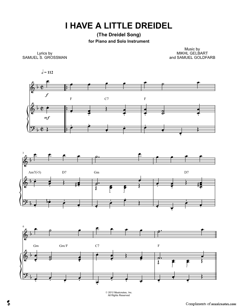 1. I Have a Little Dreidel - Piano Accompaniment (click here to preview and play this piece) Composers: Lyricist: Scored For:Solo & Accompaniment and Instrumental Part Instruments:Piano Accompaniment, C Instrument, range: F5-F6, Violin, Oboe, Flute and Recorder Number of pages:2 Click here to purchase this piece separately for $5.99 |