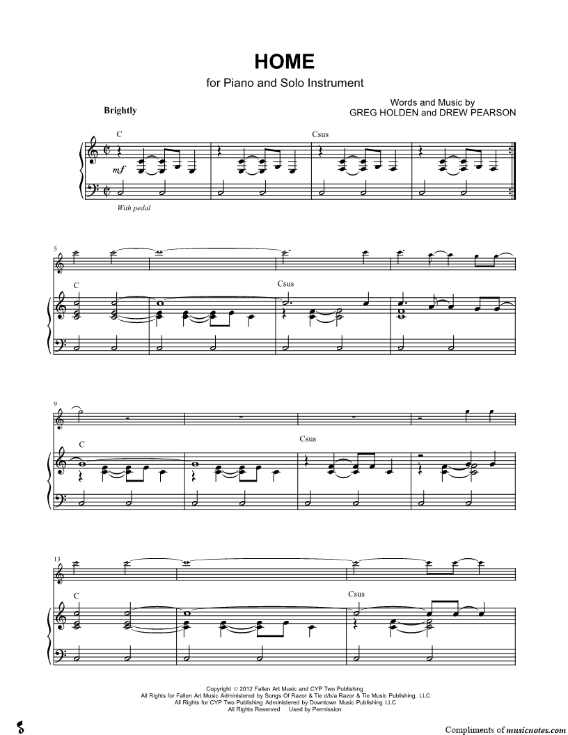 2. Home - F Instrument (click here to preview and play this piece) Performer: Composers: Lyricists: Scored For:Instrumental Solo and Instrumental Part Instrument:F Instrument, range: G3-C5 Number of pages:3 Click here to purchase this piece separately for $4.99 |