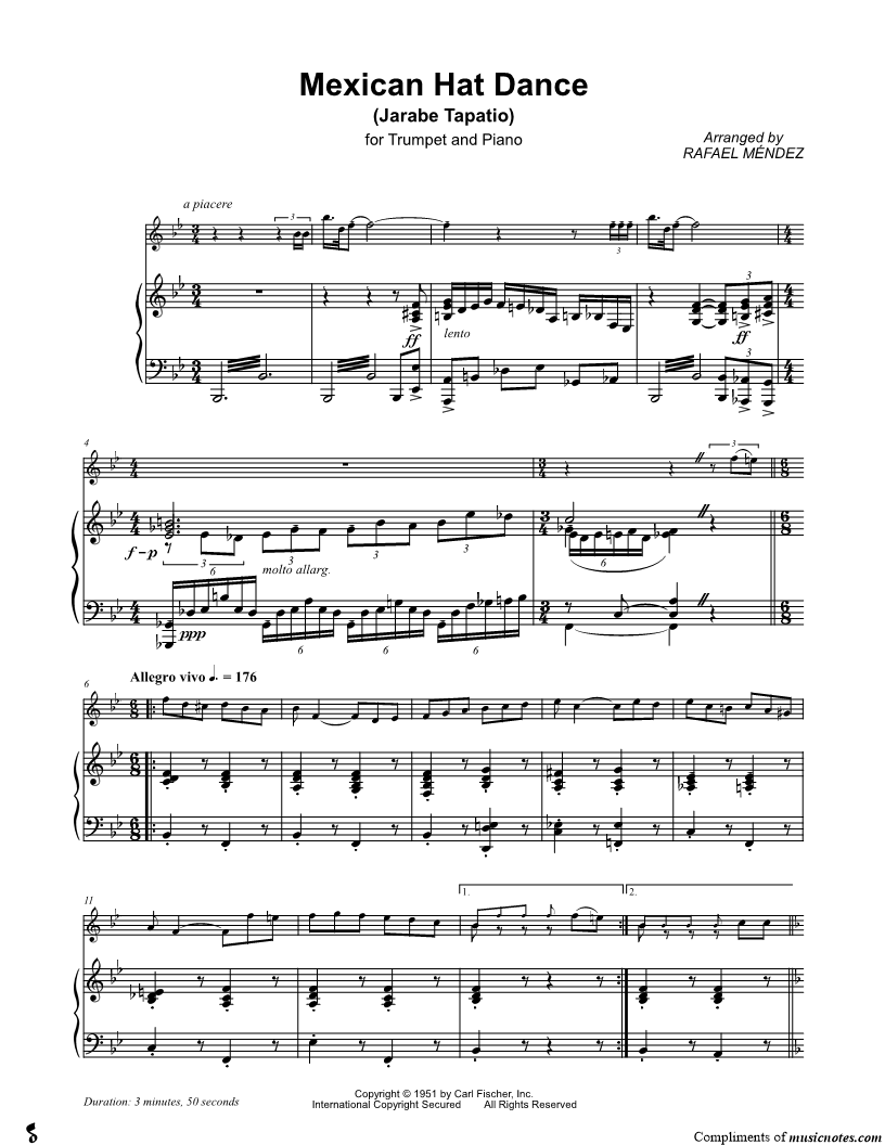 1. Mexican Hat Dance - Piano Accompaniment (click here to preview and play this piece) Composer: Scored For:Solo & Accompaniment and Instrumental Part Instruments:Trumpet, range: D4-Bb5 and Piano Accompaniment Number of pages:14 Click here to purchase this piece separately for $5.99 |