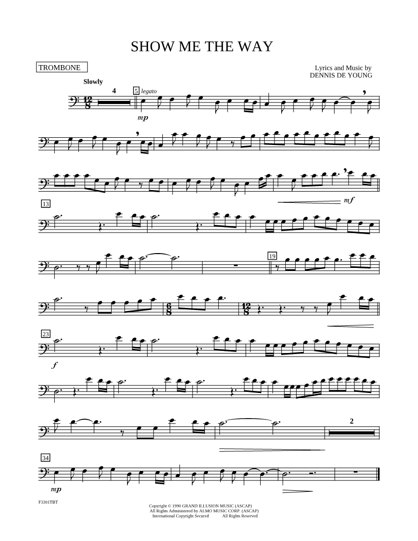 1. Show Me the Way - Trombone (click here to preview and play this piece) Composer: Lyricist: Scored For:Instrumental Solo and Instrumental Part Instrument:Trombone, range: C3-E4 Number of pages:1 Click here to purchase this piece separately for $4.99 |