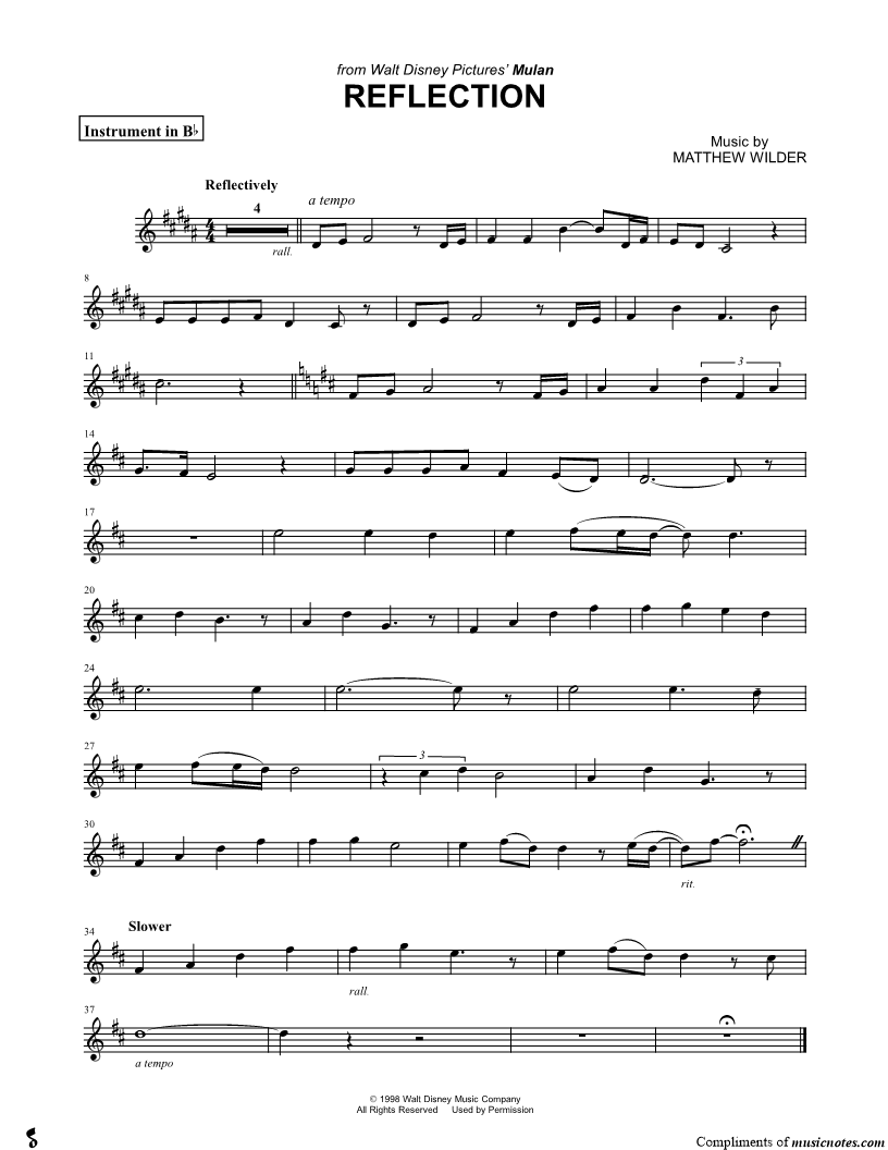 1. Reflection - Bb Instrument (click here to preview and play this piece) Performers: Composer: Lyricist: Scored For:Instrumental Solo and Instrumental Part Instruments:Bb Instrument, range: C#4-G5, Trumpet, Soprano Saxophone, Tenor Saxophone and Clarinet Number of pages:1 Click here to purchase this piece separately for $4.99 |