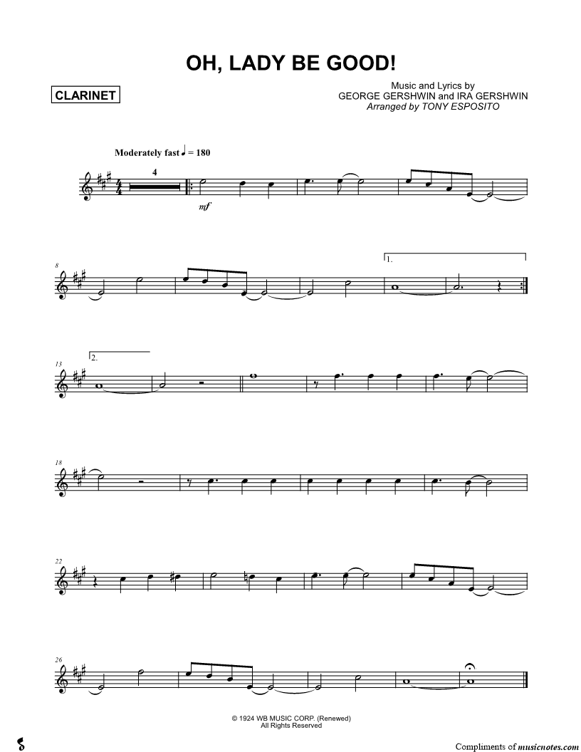 1. Oh, Lady Be Good! - Clarinet (click here to preview and play this piece) Composers: Lyricists: Scored For:Instrumental Part and Instrumental Solo Instrument:Clarinet Number of pages:1 Click here to purchase this piece separately for $4.99 |